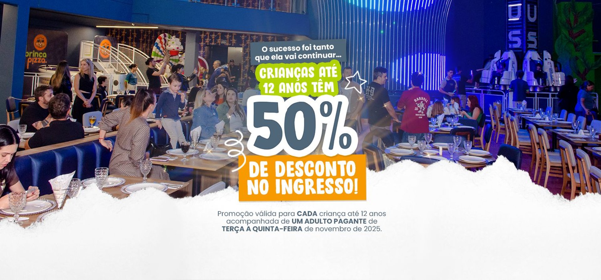 Com uma super estrutura inédita no Brasil construída em 1.200 m2, nosso espaço comporta 270 pessoas e reúne rodízio de pizza e entretenimento indoor com mais de 25 atrações.